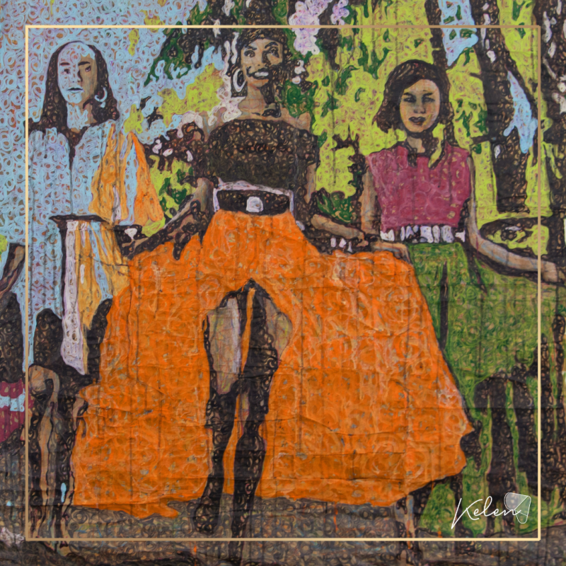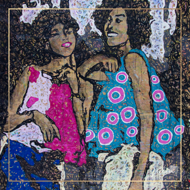 Les peintures de Diafrel douces et apaisantes sont toutes empreintes de sa signature: l’utilisation de supports de récupération comme toile de fonds de ses œuvres.