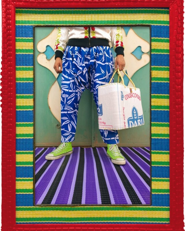 Dans son exposition “Legs Series”, Hajjaj réinvente le portrait traditionnel en se focalisant sur les jambes pour aborder les thèmes de la migration, de l’hybridité et de l’appartenance. Ses œuvres, souvent encadrées de pneus recyclés ou de nattes en plastique, célèbrent les histoires de voyages et les figures du nomadisme moderne.