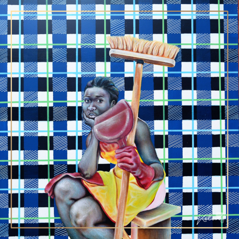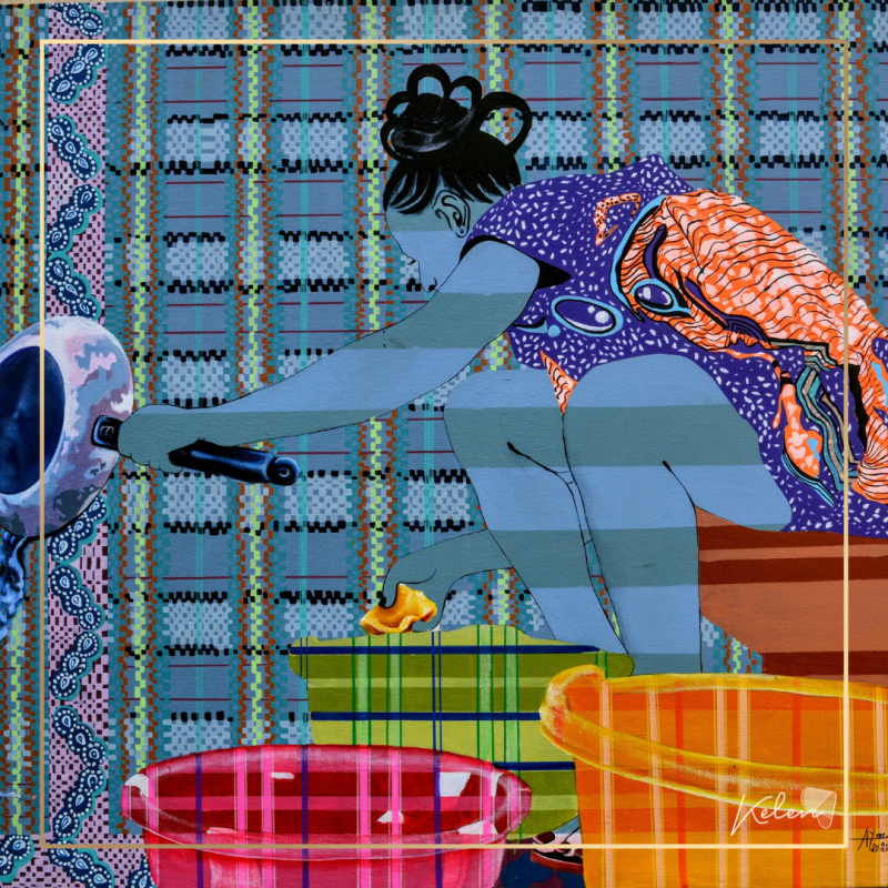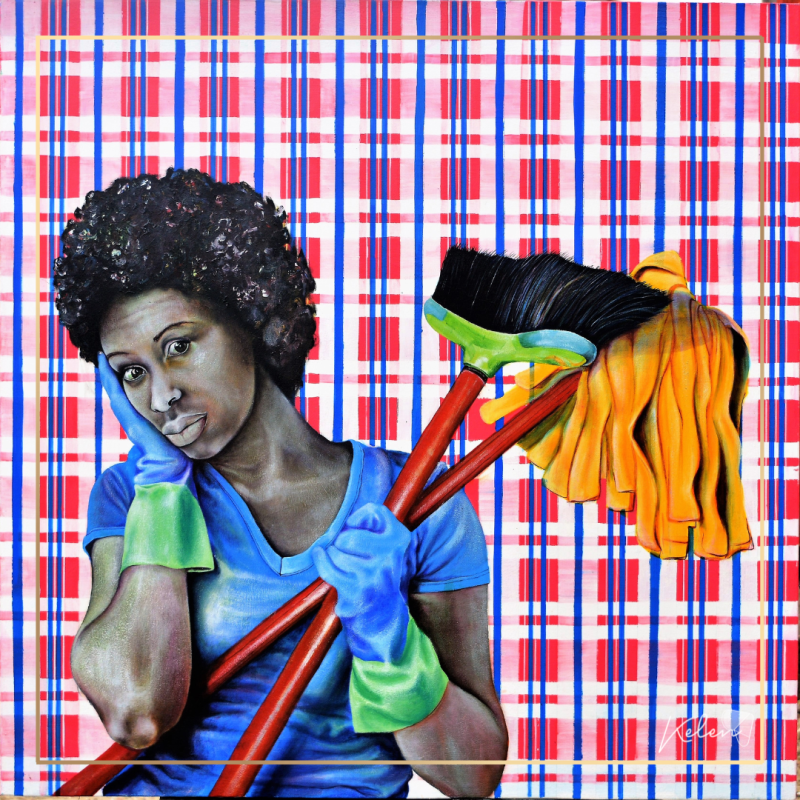 L’artiste camerounaise Alida Ymele s’inspire aussi de cet accessoire. Les rayures, tantôt en fond de toiles, tantôt sur les visages, sont présentes dans ces oeuvres. Les femmes sont bien souvent au centre de ses travaux: des femmes fortes fortes et puissantes!